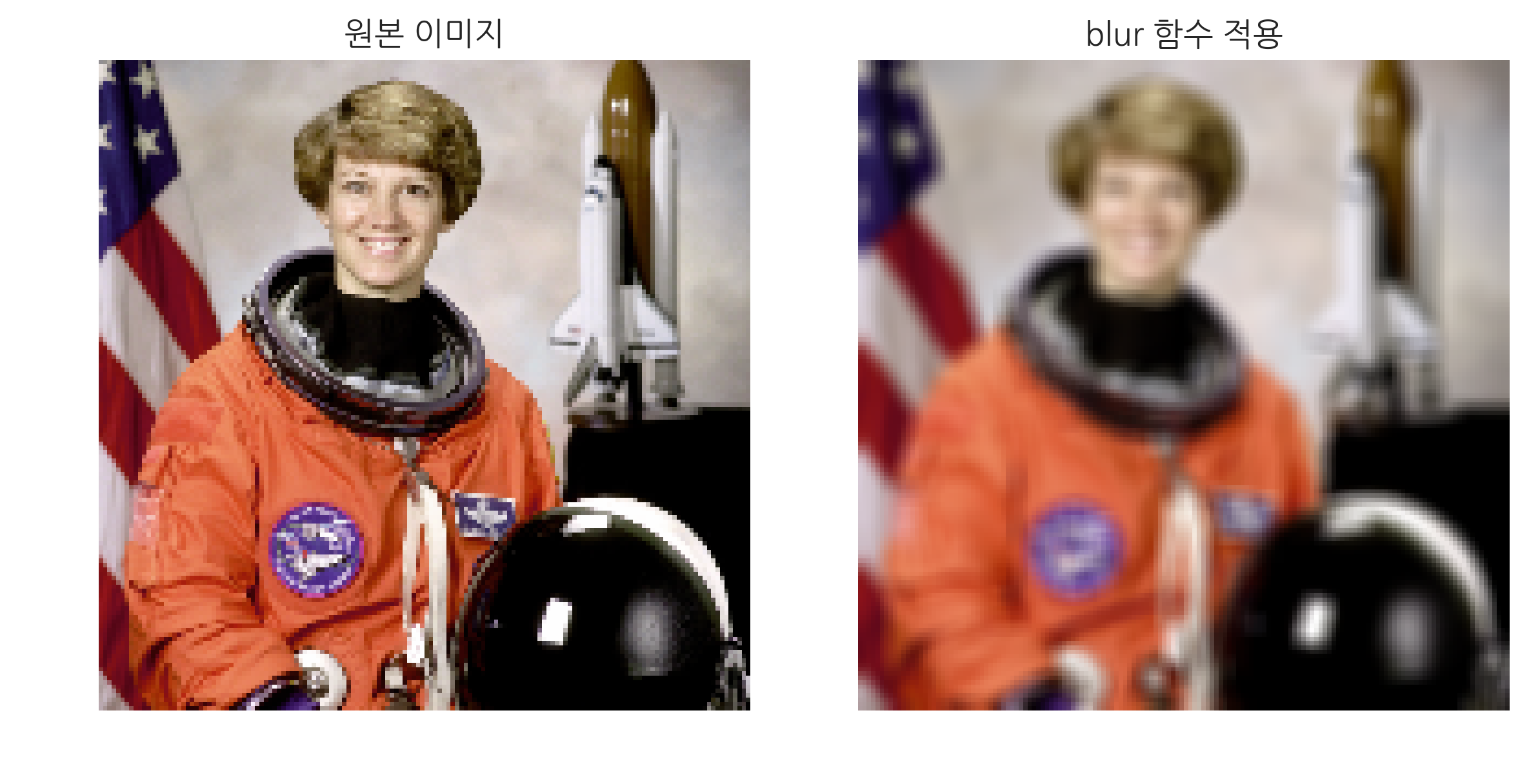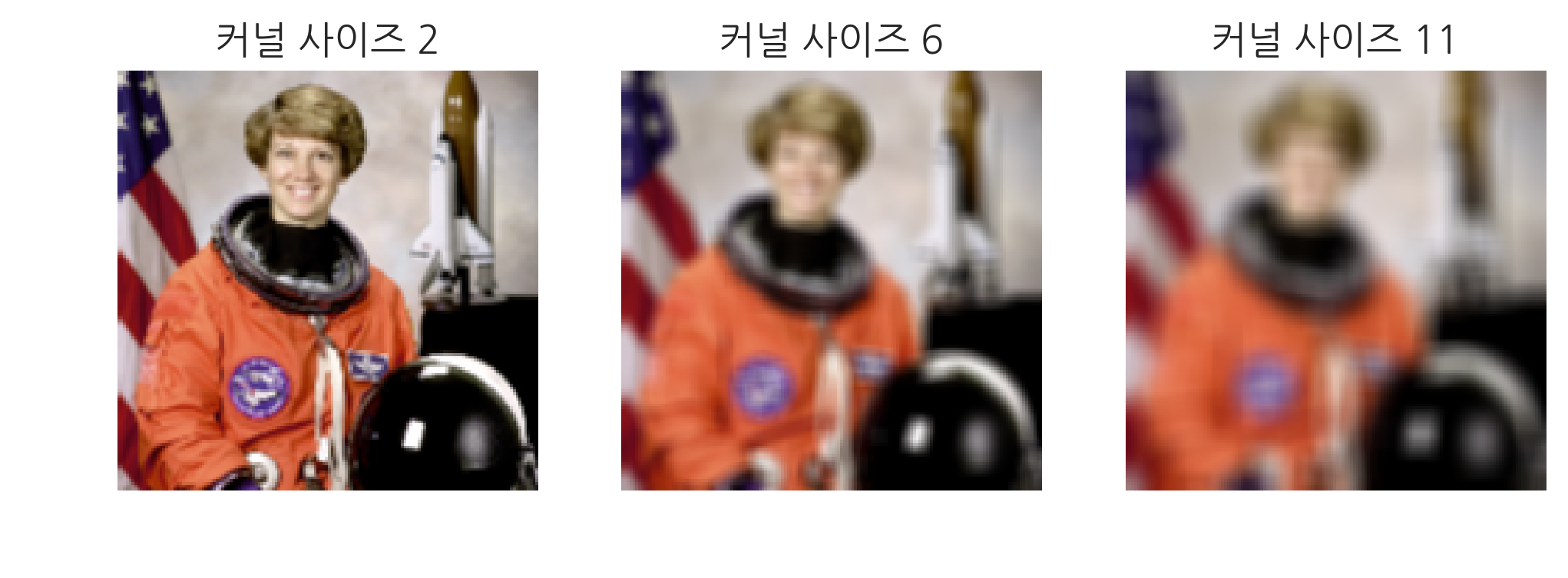 다음 코드는 평균을 구하는 커널 적용한 예다. 커널 크기가 커지면서 이미지가 점점 더 흐려지는 것을 볼 수 있다.
