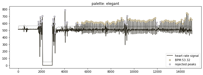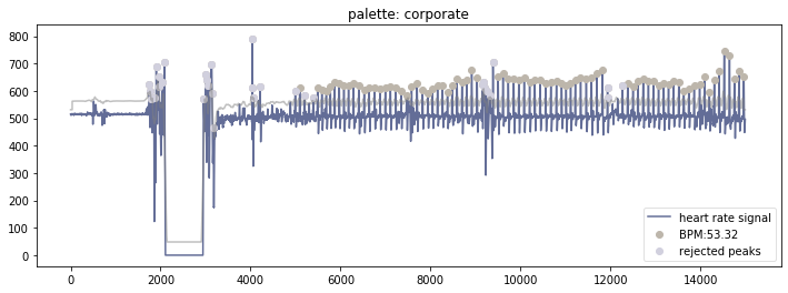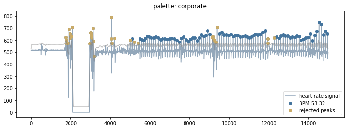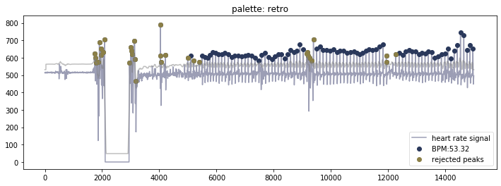 wd, m = hp.process(data, 100.0, clean_rr = True)