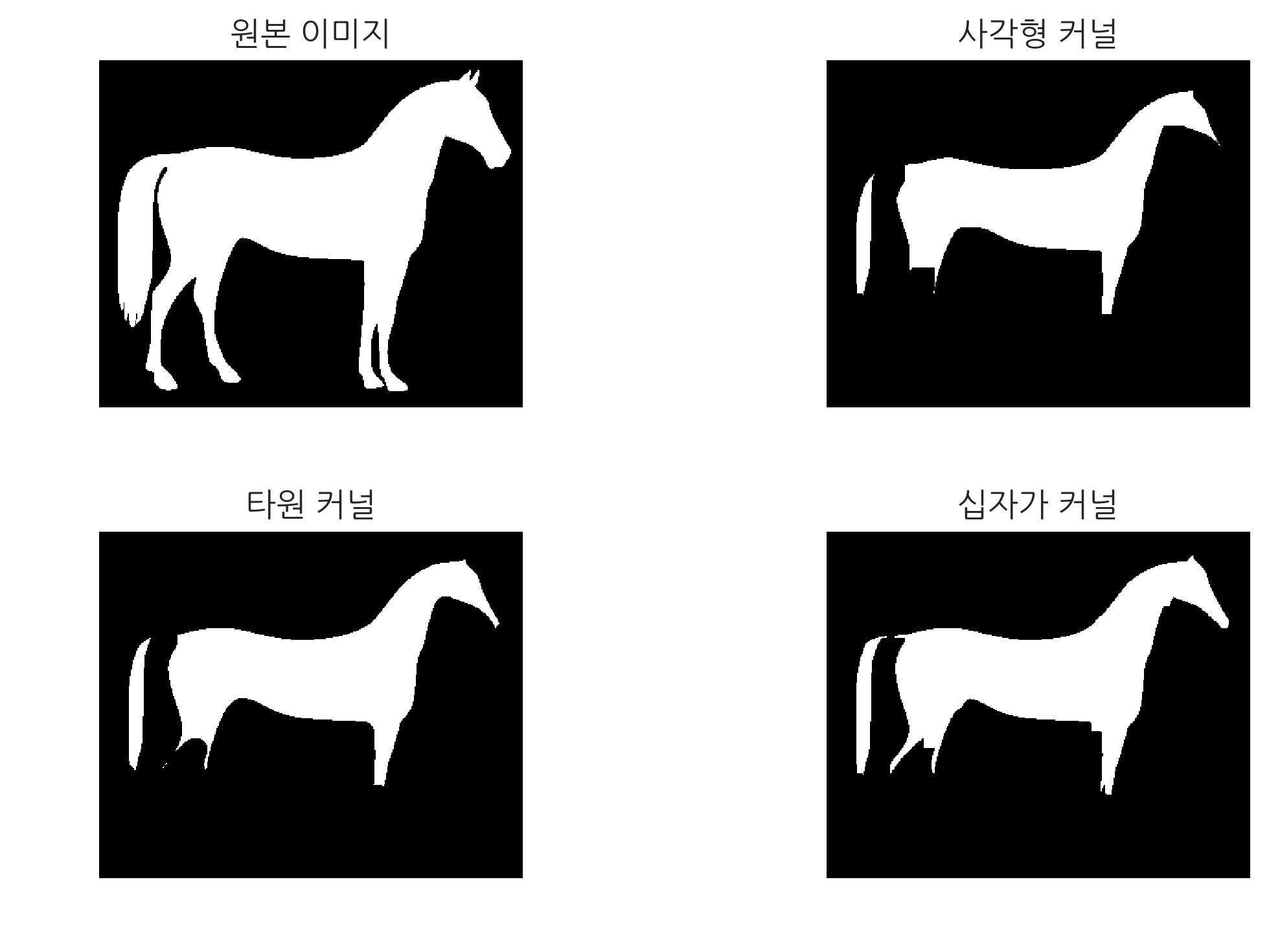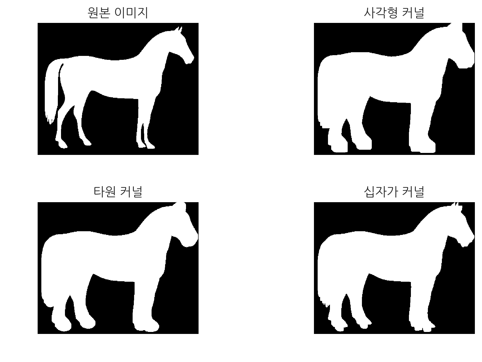 다음 코드는 이미지를 여러 커널 모양을 이용하여 침식 기법으로 변환한다. 검은색이 0인 영역, 흰색이 1인 영역이다. 검은색 (0)이 흰색을 침식해 들어가는 것을 알 수 있다.