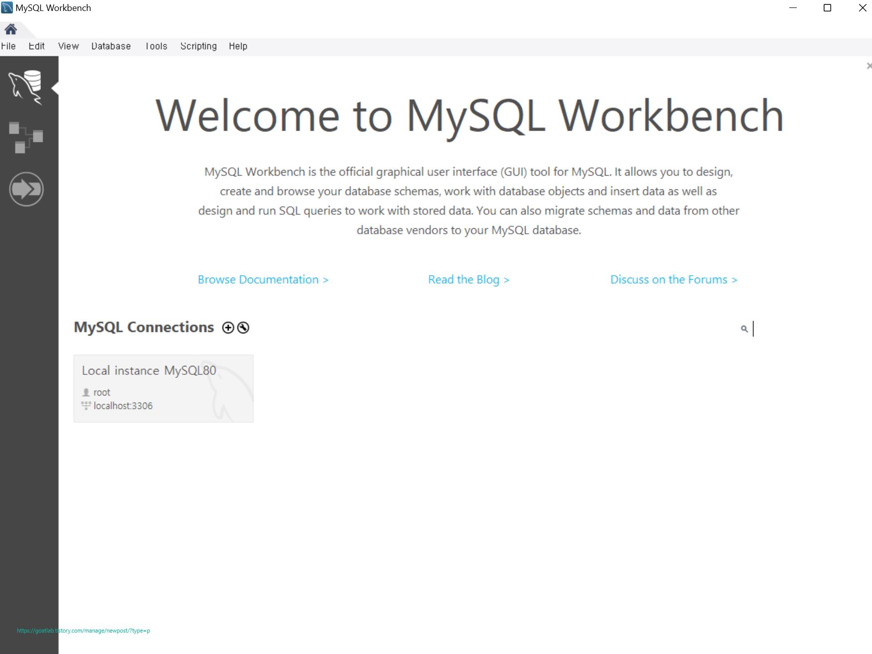 MySQL Workbench를 실행하면 나오는 기본 창이다.