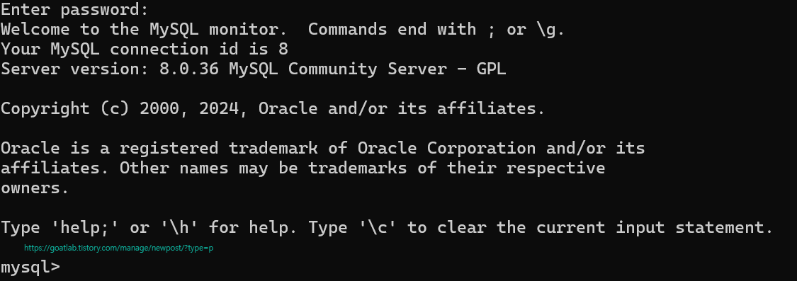 다음 명령어를 통해Ubuntu에서 실행되고 있는 MySQL 서버에 접속한다. 반드시 Ubuntu에서 MySQL 서버가 동작 중이어야 한다.