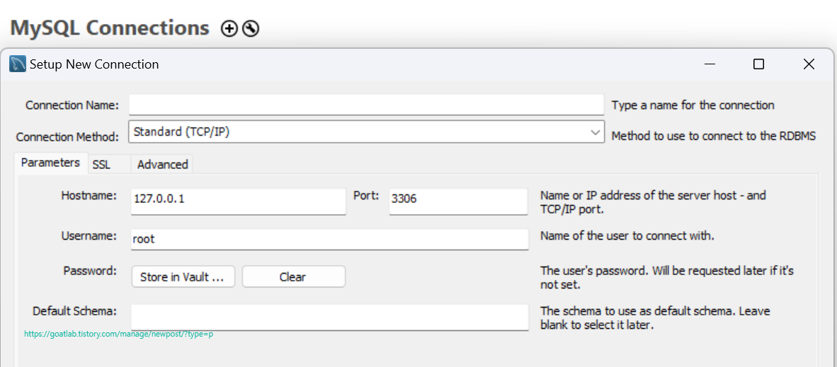 MySQL Connections 옆 + 버튼을 클릭하고 setup을 진행한다.