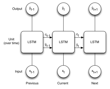 y 값은 unit의 출력이며, x 값은 unit에 대한 입력이며, c 값은 context 값이다. 출력 및 컨텍스트 값은 항상 다음 시간 슬라이스에 출력을 공급한다. context 값을 사용하면 네트워크가 통화 간 상태를 유지할 수 있다. 그림은 LSTM 계층의 내부를 보여준다.