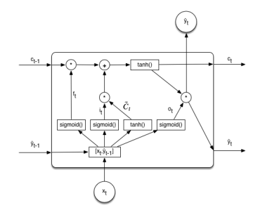 이 두 기능 모두 출력을 특정 범위로 압축한다. 시그모이드 함수의 경우 이 범위는 0 ~ 1이다. 쌍곡선 접선 함수의 경우 이 범위는 -1 ~ 1이다. LSTM은 내부 상태를 유지하고 출력을 생성한다. 다음 다이어그램은 아래 그림에서 설명한 바와 같이 현재 타임슬라이스 (t)와 이전 (t-1) 및 다음 (t+1) 슬라이스의 세 번에 걸친 LSTM 장치를 보여준다.
