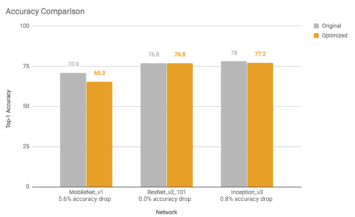 TFLite가 사용하는 가장 유용한 최적화 중 하나는 양자화이다. 양자화는 주어진 실수 값에 대해 상위 비트보다 하위 비트 표현을 사용한다. 예를 들어, 32비트 (또는 4바이트) 부동 소수점 숫자와 같은 연속 실수를 8비트 (또는 1바이트) 정수와 같은 이산 숫자로 나타낼 수 있다. 딥러닝에서 가중치와 편향 (또는 단순히 신경망의 매개변수)은 32비트 부동 소수점 숫자로 저장되므로 모델 교육 중에 고정밀 계산이 발생할 수 있다. 그리고 모델이 훈련될 때 8비트 정수로 축소될 수 있으며 이는 결국 모델 크기의 축소를 의미한다. 16비트 부동 소수점 (크기 2배 감소) 또는 8비트 정수 (크기 4배 감소)로 줄일 수 있다. 물론, 이것은 모델 예측의 정확성에 대한 절충과 함께 올 수 있다. 그러나, 그것은 양자화된 모델은 특히 16비트 부동 소수점을 사용하여 모델의 크기를 절반으로 줄이는 경우 상당한 감쇠를 겪지 않거나 전혀 감쇠하지 않음을 많은 상황에서 경험적으로 보여준다. 마찬가지로 활성화 값을 양자화할 수도 있지만 대표적인 데이터 세트에서 일부 스케일링 매개변수를 결정하려면 보정 단계가 필요하다. 이것은 "전체 양자화" 하위 섹션에 자세히 설명되어 있다. 그림은 각각 모델 크기, 대기 시간 및 정확도에 대한 전체 양자화 (8비트 INT에 대한 가중치 및 활성화 값)의 영향과 관련된 몇 가지 예를 보여준다. 그들은 실험을 위해 Google Android Pixel 2를 사용했다.