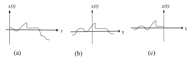 인과 신호는 음수 시간에 대해 0 값을 갖는 신호이다. 즉, t < 0이다. 음수 시간과 양수 시간 모두에 대해 0이 아닌 값이 있는 경우 신호는 비인과적이다. 반인과 신호는 양의 시간에 대해 0 값, 즉 t > 0을 갖는다. 인과 신호, 비인과 신호 및 반인과 신호의 예는 각각 그림 (a), (b) 및 (c)에 나와 있다.