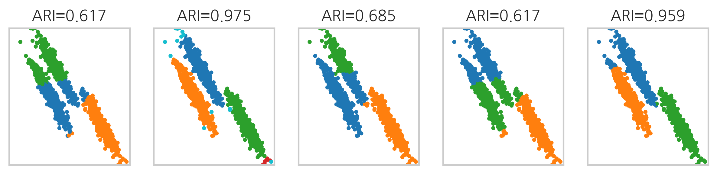 군집화 방법마다 특성이 다르므로 원하는 목적과 데이터 유형에 맞게 사용해야 한다. 또한 지정된 모수의 값에 따라 성능이 달라질 수 있다. 이 결과는 최적화된 모수를 사용한 결과는 아니라는 점에 유의해야 한다.