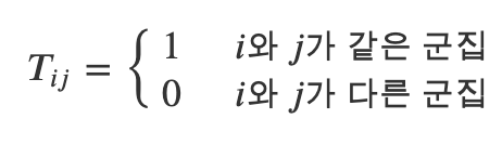 랜드지수를 구하려면 데이터가 원래 어떻게 군집화되어 있어야 하는지를 알려주는 정답 (groundtruth)이 있어야 한다. 𝑁개의 데이터 집합에서 𝑖, 𝑗 두 개의 데이터를 선택하였을 때 그 두 데이터가 같은 군집에 속하면 1 다른 데이터에 속하면 0이라고 하자. 이 값을 𝑁×𝑁 행렬 𝑇로 나타내면 다음과 같다.