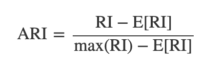 adjusted Rand index는 성능이 완벽한 경우 1이 된다. 반대로 가장 나쁜 경우로서 무작위 군집화을 하면 0에 가까운 값이 나온다. 경우에 따라서는 음수가 나올 수도 있다.
