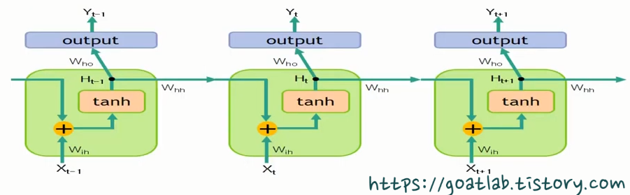 | Xt-1, Xt, Xt+1은 입력데이터를 나타내고 Ht-1, Ht, Ht+1은 은닉층 개념의 SimpleRNN 레이어 출력값을 Yt-1, Yt, Yt+1은 출력층의 출력값을 나타낸다. 학습 대상의 가중치는 입력층과 은닉층 사이의 가중치 Wih, 시간 t에서의 은닉층과 시간 t+1에서의 은닉층 간의 가중치 Whh, 은닉층과 출력층 사이의 가중치 Who로 구성된다. 시간 t에서 은닉층 SimpleRNN 레이어 출력은 Ht = tanh(XtWih + Ht-1Whh)이다. |