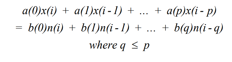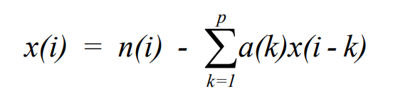 이 방정식은 자동 회귀(AR) 모형을 나타냅니다. x(i)가 과거 값으로 회귀하기 때문에 자기 회귀이다. 다시 말해서, x(i)는 x의 과거 값에 대한 선형 외삽 (또는 예측)으로 볼 수 있다.