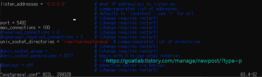 외부 접속 허용을 위해 listen_addresses = '0.0.0.0'로 수정한다.