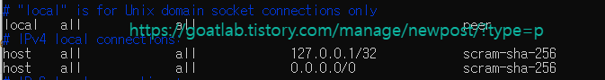 외부 접속 허용을 위해 listen_addresses = '0.0.0.0'로 수정한다.