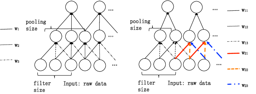 DNN에서는 하나의 출력값에 각각 다른 가중치들이 사용되고 있다. 반면, CNN은 하나의 출력값에 같은 가중치들이 사용되고 있다. 다시말해, CNN에서는 각각의 출력값들이 동일한 weight를 sharing하고 있다.