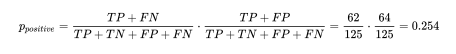 확률 이론에 대한 자세한 지식이 없는 독자의 경우, p 양수 = p1positive · p2positive이고 위첨자는 비율을 나타낸다. 따라서, 추정기에 대한 실측값을 고려할 때 첫 번째 항은 총 참 양의 확률 (TP + FN)을 나타내며 두 번째 항은 총 예측 양의 확률 (TP + FP)을 나타낸다. 같은 방법으로 pnegative를 얻는다.