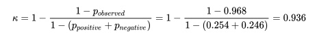 TP = 61, FN = 1, FP = 3, TN = 60이 있다. Cohen's Kappa의 모수는 다음과 같이 계산된다.