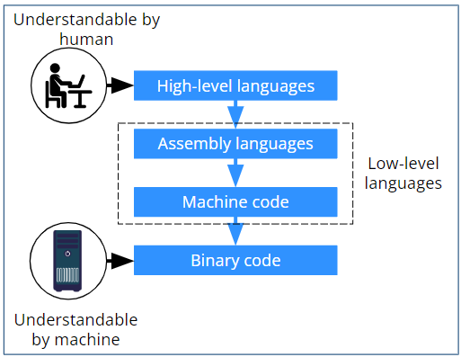 프로그래밍 언어는 컴퓨터 시스템을 구동시키는 소프트웨어를 작성하기 위한 형식 언어이다. 고급 언어일수록 사람이 사용하는 언어에 가깝다. 고수준 언어 (high-level programming language)는 사람이 이해하고 작성하기 쉽게 만들어진 언어 (ex: Python, Java, C)이다. 반면, 저수준 언어 (low-level programming language)는 컴퓨터가 이해하고 실행할 수 있는 언어 (ex: 기계어, 어셈블리어)이다.