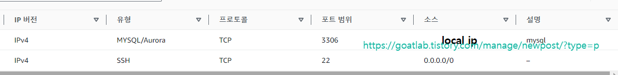 local에서 EC2 MySQL에 접속하기 위해 인바운드 규칙을 설정한다.