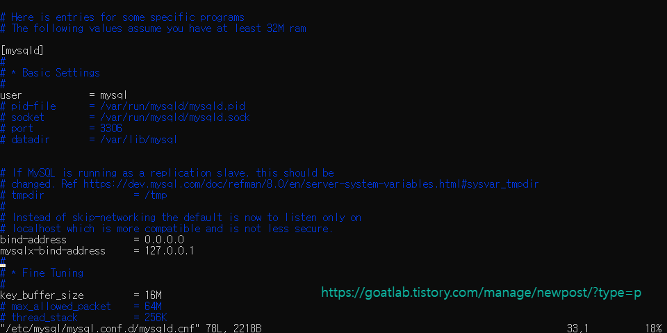 명령 프롬프트를 bind-address로 이동하고 키보드에서 i 를 입력해서 INSERT 모드로 변경한다. 여기서, bind-address의 127.0.0.1을 0.0.0.0으로 변경해야 외부 접속이 가능하다.