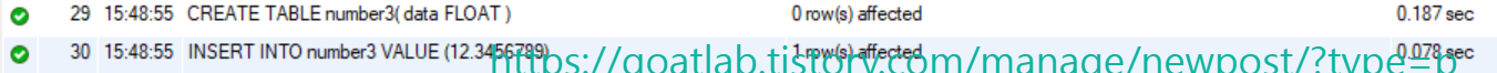 | FLOAT (4byte) | 정수부와 실수부를 합쳐 6자리의 숫자를 입력할 수 있 |