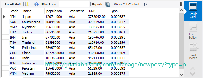 # 출력 : 국가코드, 국가이름, 인구수, 대륙, GNP