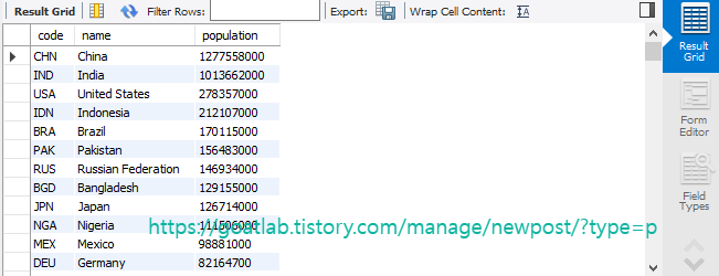 # 출력 : 국가코드, 도시이름, 인구수