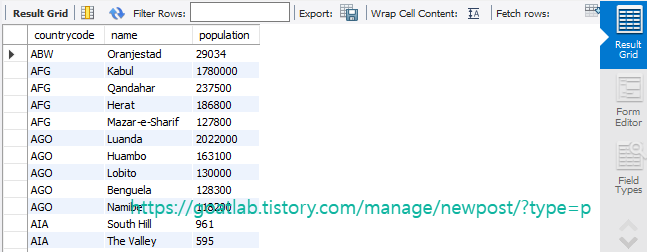 # 출력 : 국가코드, 도시이름, 인구수