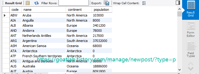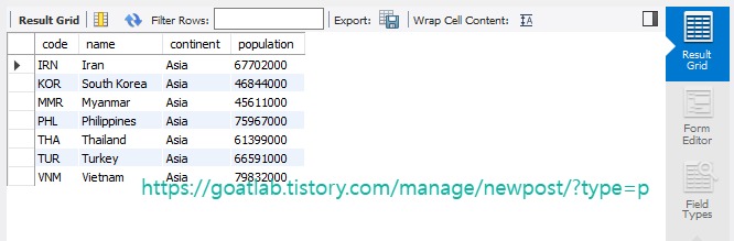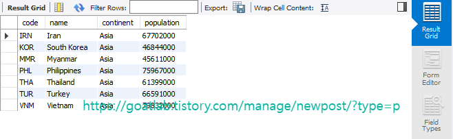 # 컬럼 : 국가코드, 국가이름, 대륙이름, 인구수