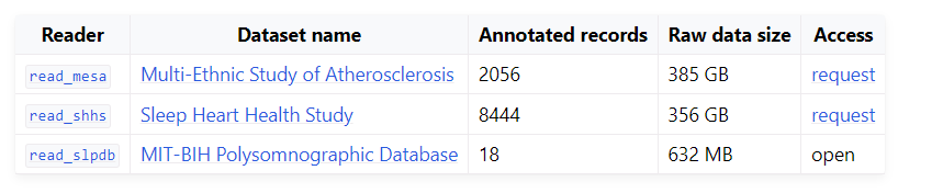 SleepECG는 다양한 데이터 세트에 대한 리더 기능을 제공한다. data_dir모든 필수 파일은 기본적으로 ~/.sleepecg/datasets에 지정된 위치에 다운로드된다. 지원되는 모든 PhysioNet 데이터세트는 누구나 액세스할 수 있지만 NSRR 데이터세트는 데이터 액세스 요청을 제출 해야한다.