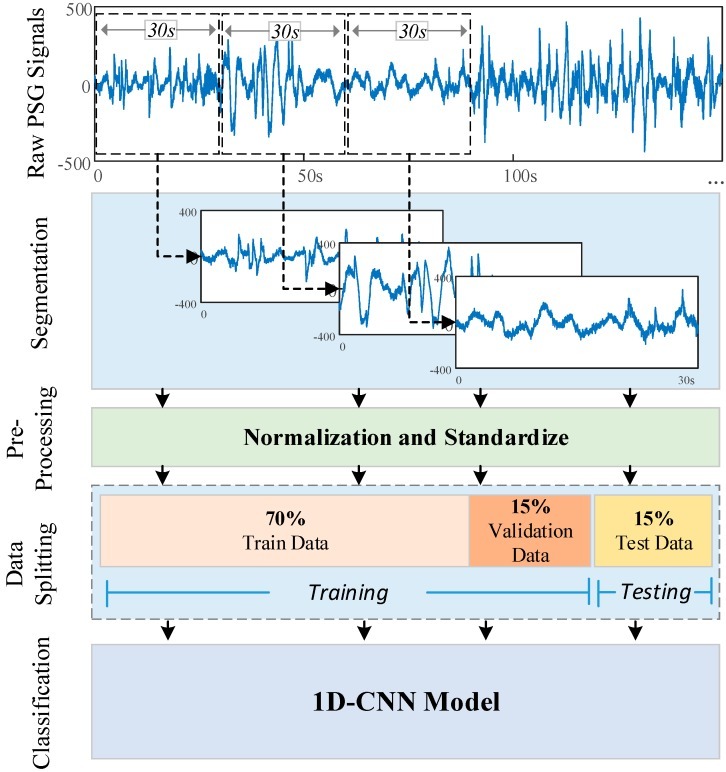 데이터베이스의 원시 PSG 신호는 30-s 세그먼트로 분할되었다. 따라서, 각 최면도 값에 대해 표본이 3000개인 PSG 세그먼트가 사용되었다. 실험 연구에서, 결과는 두 수면 데이터베이스 모두에서 취해진 다른 PSG 신호를 사용하여 평가되었다. 단일 채널 EOG, 단일 채널 EEG 및 단일 채널 EOG + 단일 채널 EEG와 같은 PSG 신호의 조합을 사용하여 데이터베이스를 분석했다. 단일 채널 EOG 채널 신호는 기록에 하나의 수평 EOG 신호를 포함한다. 단일 EEG는 각 레코드에 Fpz-Cz 채널 신호로 구성된다. 단일 채널 EOG + 단일 채널 EEG의 경우, 각 기록마다 하나의 수평 EOG 및 Fpz-Cz EEG 신호가 사용되었다. 이러한 신호가 CNN 모델에 입력으로 주어졌을 때, 모호한 점수 ('X', '?' 등)에 대해 샘플 제거가 수행되었다. 또한, 특정 진폭 범위에서 노이즈가 있는 신호를 제거하는 등의 필터링 작업이 더 이상 수행되지 않았다. 신호에 대한 전처리 작업에는 0부터 1까지의 범위에 대한 신호의 표준화 및 정규화가 포함된다. 전체 데이터 세트는 교육, 검증 및 테스트를 위해 각각 70%, 15% 및 15%의 세 부분으로 나뉘었다. 모델의 훈련 단계에서 계층 매개 변수를 결정하기 위해 훈련 및 검증 데이터 세트가 사용되었다. 테스트 데이터는 모델이 이전에 사용하거나 보지 못한 새로운 데이터 세트였습니다. 모델의 테스트 성능은 훈련된 모델에 대해 수행되었다.