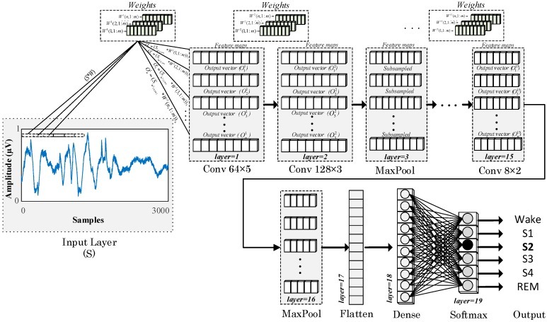 3000개의 샘플이 있는 사전 처리된 PSG 신호 세그먼트가 입력으로 사용된다. 이러한 PSG 신호는 64 × 5 필터와 3개의 보폭 비율로 모델의 첫 번째 레이어에서 컨볼루션되어 64 × 999 크기의 피처 맵을 생성한다. 모델의 두 번째 레이어는 128 × 5 필터가 있는 또 다른 컨볼루션 레이어이다. 이 계층은 이전 계층의 출력을 사용하여 128 × 997 크기의 새로운 피쳐 맵을 생성합니다. MaxPool 계층에서 두 출력 벡터의 두 단위 영역의 최대값은 단일 값으로 줄어든다. 따라서, 입력 피쳐 맵은 128 × 498 차원으로 축소된다. 모델의 연속적인 레이어에서 이러한 프로세스는 비슷한 방식으로 반복되지만 크기가 다른 필터를 사용한다. Dropout 레이어는 과적합 문제를 방지하기 위해 모델에 배치된다. Flatten 레이어에서 입력 벡터의 치수는 Dense 레이어에 대한 적절한 치수로 변환된다. 마지막으로 Softmax 레이어에서 입력 신호는 출력 신호에 매핑된다. 따라서 이 계층의 단위 수는 클래스 수 (nb_class)와 동일하다.
