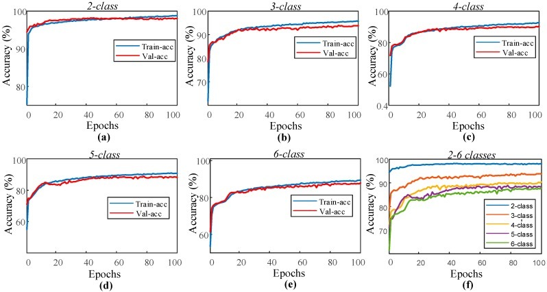 딥러닝 구현은 Python 프로그래밍 언어를 사용하여 실현되었다. 모델을 만들고 실험 결과를 수집하는 데 Keras가 사용되었고, 백엔드로 TensorFlow가 사용되었다. 테스트를 위해 인텔 코어 i7-7700HQ 2.81GHz CPU, 16GB RAM, NVIDIA 지포스 GTX 1070 8GB 그래픽 카드를 탑재한 컴퓨터가 사용되었다. 다섯 가지 다른 수면 수업에 대한 실험 결과를 얻었다. 이러한 등급의 정의는 표에 제시되어 있다.