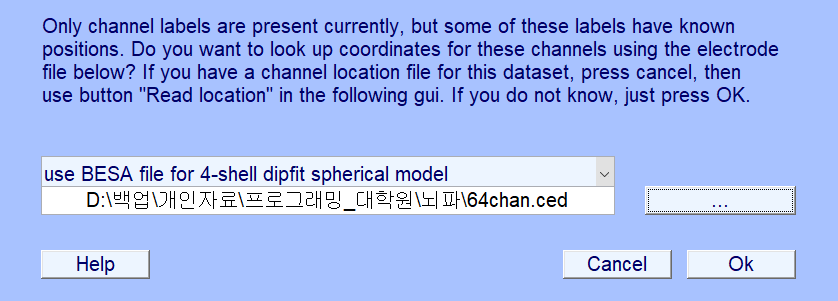 3. 다운받은 64chan.ced를 입력한다. 본 파일이 없더라도 64 channel에 맞는 라벨을 EEGLAB에서 기본 제공하고 있다.