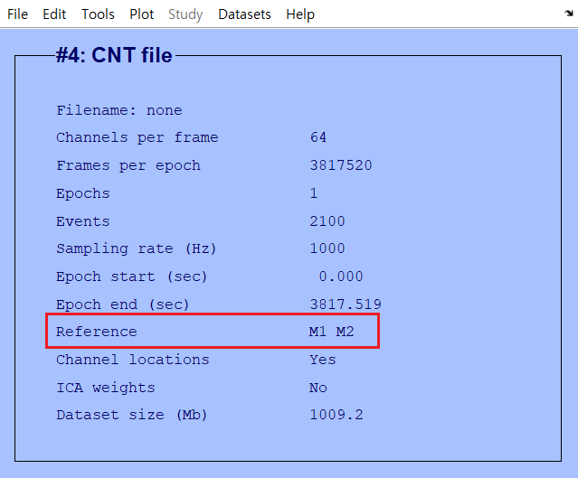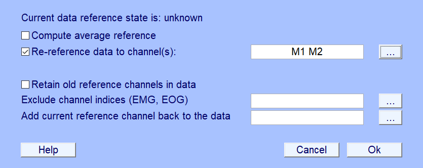 1. 실험 진행시 default로 설정된 reference는 64 채널 캡 중앙에 있는 'reference' 전극 (= vertex)이다. 하지만 많은 ERP 연구들에서 귀 뒤에 reference용으로 측정한 M1과 M2를 reference로 많이 사용하고 있기 때문에, 이를 새로운 reference로 설정한다.