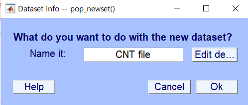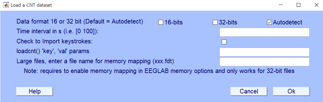 EEG = pop_loadcnt('D:\EEG 파일 모음\내 실험\Ex1_n2pc_tar\뇌파데이터\n2pc_02_23_03.cnt' , 'dataformat', 'auto', 'memmapfile', '');