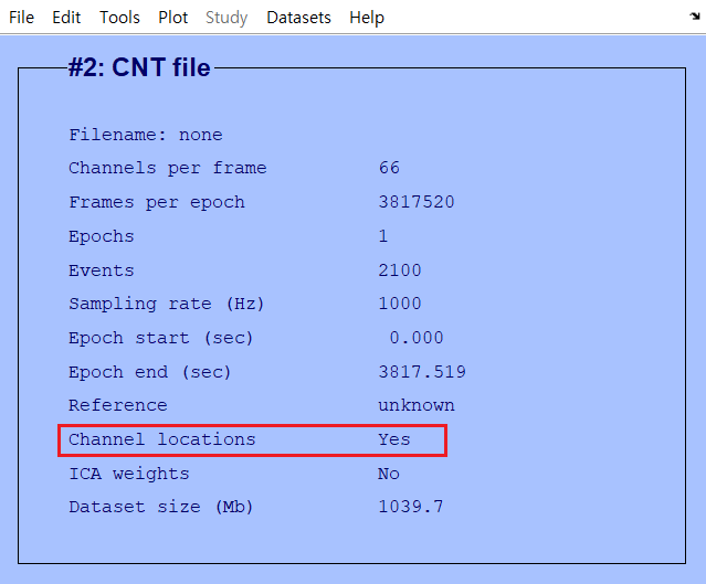 6. [Ok] 버튼을 눌러서 나오면 다음과 같이 channel location이 잘 반영된 것을 확인할 수 있다. 본 작업은 여러 실험 파일에 모두 동일한 작업을 해야하기 때문에 일일히 하지 않고, 추후에 matlab script로 돌린다. 이를 위해 방금 한 작업을 matlab 코드로 확인하려면 eegh() 함수를 사용한다.