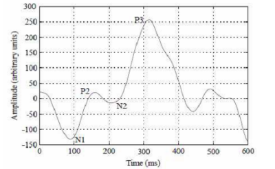 ERP 파형 그림에는 자극의 시작부터 시간에 따른 전체 전압 변화가 포함되어 있다. 여기에는 관련 ERP 구성 요소가 될 수 있는 여러 웨이브 피크가 포함되어 있다. 각 양 (P) 및 음 (N) 피크 뒤에는 자극 시작 (0ms)으로부터의 거리를 나타내는 숫자 (즉, N1, P2, N2, P3 등)가 온다. 이것은 가장 일반적인 명명 규칙이다.