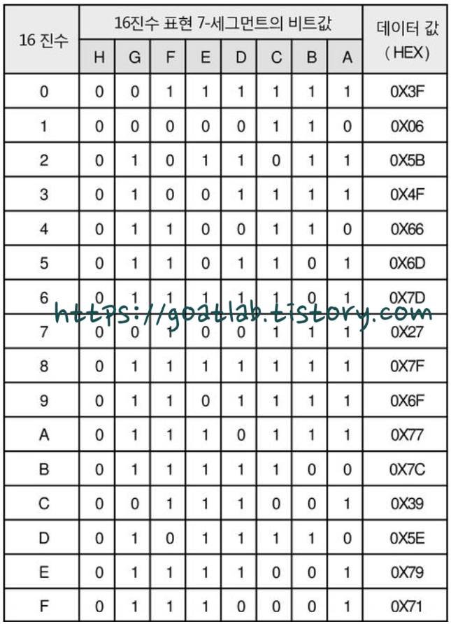 • LED 7개 (점 포함 8개)로 숫자를 표시하기 쉽도록 배열한 것 • 많이 사용하는 곳 : 엘리베이터 층 표시기, 임베디드 제품 상태 표시기 |