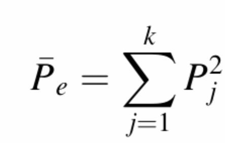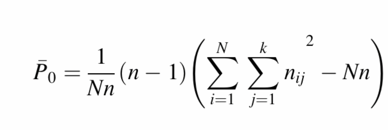 여기서 N은 대상의 총 개수, n은 대상당 평점의 개수, k는 카테고리의 개수이다. i는 대상의 인덱스, j는 카테고리의 인덱스를 나타낸다. 따라서, nij는 j번째 카테고리에 i번째 대상에 할당한 관찰자의 개수이다.