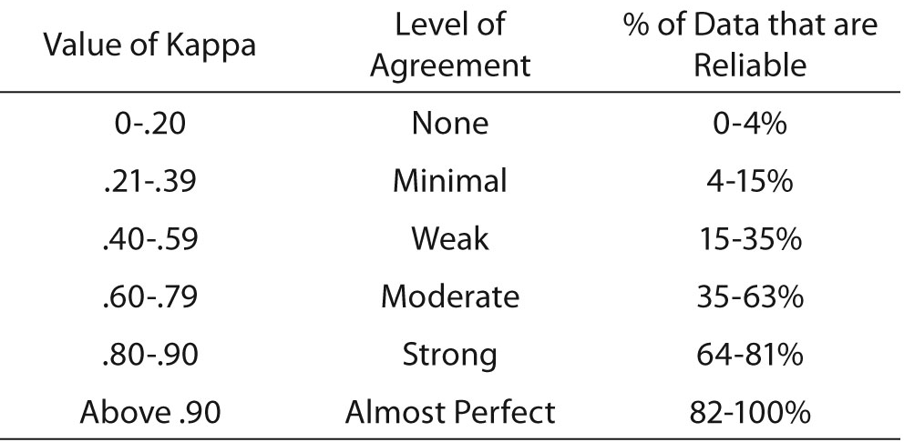 여기서 Pj는 j번째 범주에 할당된 모든 관측치 (n / N)의 비율이다 (ex: 열 합계를 모든 관측치로 나눈 값). Fleiss의 Kappa 계수에 대한 해석은 Cohen의 계수와 같다.