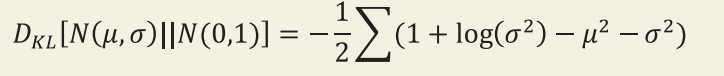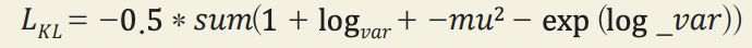 KL 발산은 한 확률 분포가 다른 분포와 얼마나 다른지 측정하는 도구다. VAE에서 평균이 mu이고 분 산이 log _𝑣𝑎𝑟인 정규 분포가 표준 정규 분포와 얼마나 다른지를 측정해야 한다. 이런 경우에 KL 발산은 다음과 같이 계산된다.