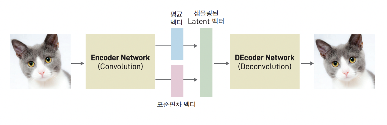 요약하면, 인코더는 입력 이미지를 받아 잠재 공간의 다변수 정규 분포를 정의하는 2개의 벡터 𝑚𝑢 (해당 분포의 평균 벡터)와 log _𝑣𝑎𝑟 (차원별 분산의 로그값)로 인코딩한다.
