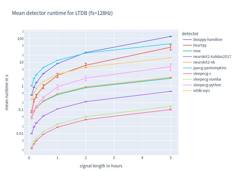최소 20시간 동안의 LTDB 레코드에서 다양한 길이의 조각을 사용하여 감지기 런타임을 평가한다. 아래 그림의 오차 막대는 평균의 표준 오차에 해당한다. 감지기의 C 백엔드는 테스트된 모든 패키지 중에서 단연 가장 빠른 구현이다 (y 축은 대수적으로 조정됨). 런타임 평가는 32GiB RAM이 장착된 Intel® Xeon® Prozessor E5-2440 v2 에서 수행되었다. 병렬화가 사용되지 않았다.