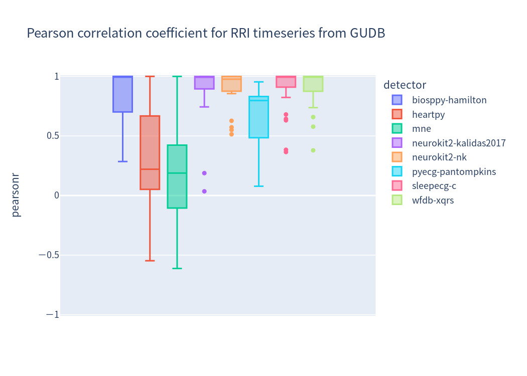 심장 박동 변동성을 분석하려면 심장 박동의 정확한 위치를 감지하는 것이 필수적이다. 탐지기가 얼마나 정확한지를 측정하기 위해 모든 GUDB 레코드에서 주석이 달린 비트 위치와 탐지된 비트 위치에서 추론된 리샘플링된 RRI 시계열 사이의 Pearson 상관 계수를 계산했다. 우리의 구현은 대역통과 필터링된 ECG 신호에서 피크를 감지하므로 후처리 없이 안정적인 RRI 시계열을 생성한다.