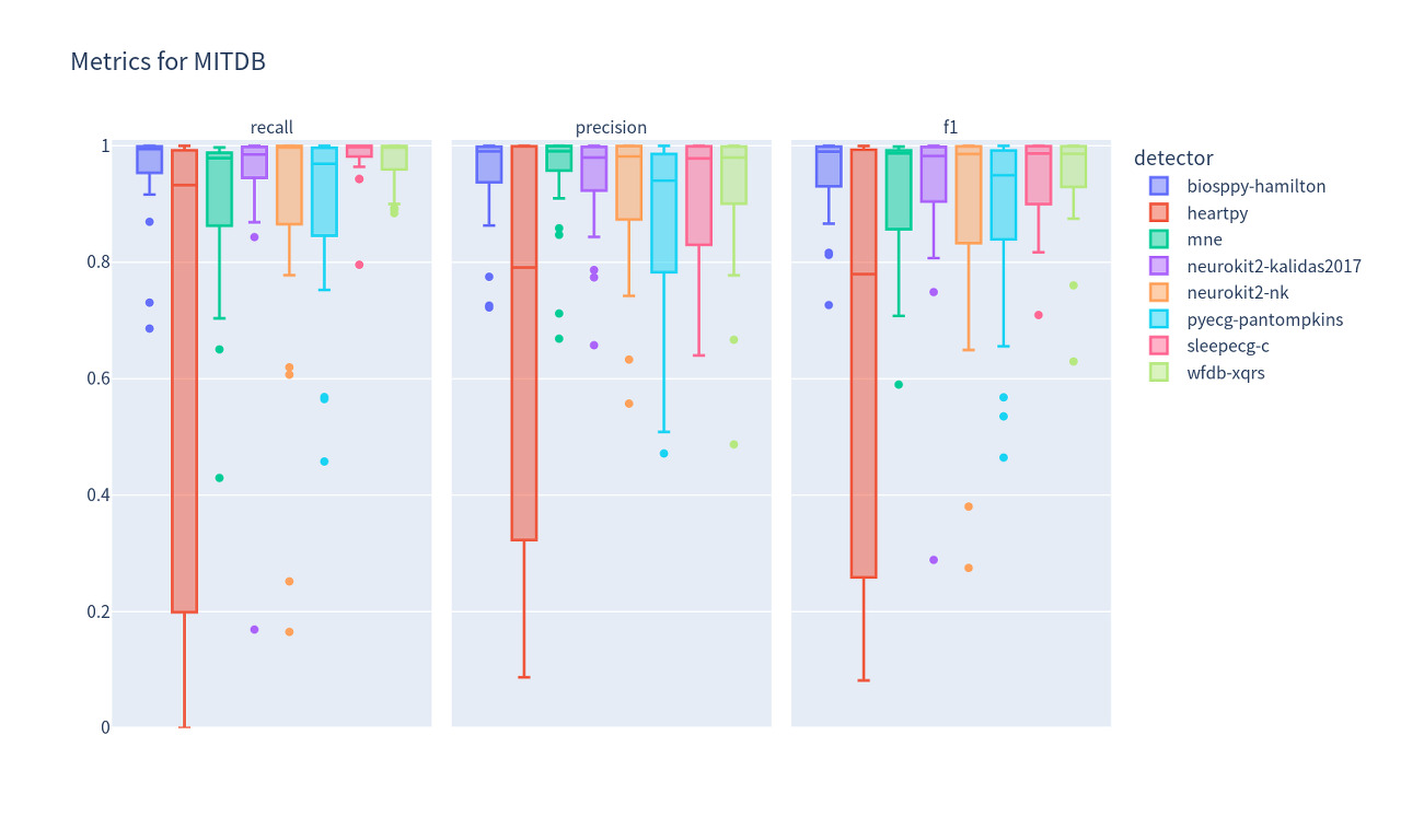 또한 모든 MITDB 레코드에 대한 탐지 성능을 평가한다. 해당 주석의 100ms (즉, 36개 샘플) 이내인 경우 성공적인 감지를 정의했다 (주석이 일반적으로 정확한 R 피크 위치와 일치하지 않기 때문에 여기에서 허용 오차를 사용하는 것이 필요함). 리콜, 정밀도 및 F1 점수 측면에서 당사의 감지기는 사용 가능한 최고의 심장 박동 감지기 중 하나이다.
