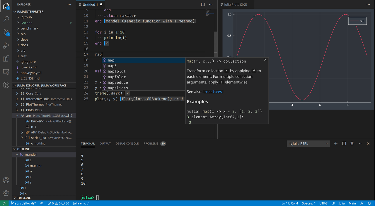 Visual Studio Code 용 Julia 확장에는 기본 제공 동적 자동 완성, 인라인 결과, 플롯 창, 통합 REPL, 변수 보기, 코드 탐색 및 기타 여러 고급 언어 기능이 포함되어 있다.
