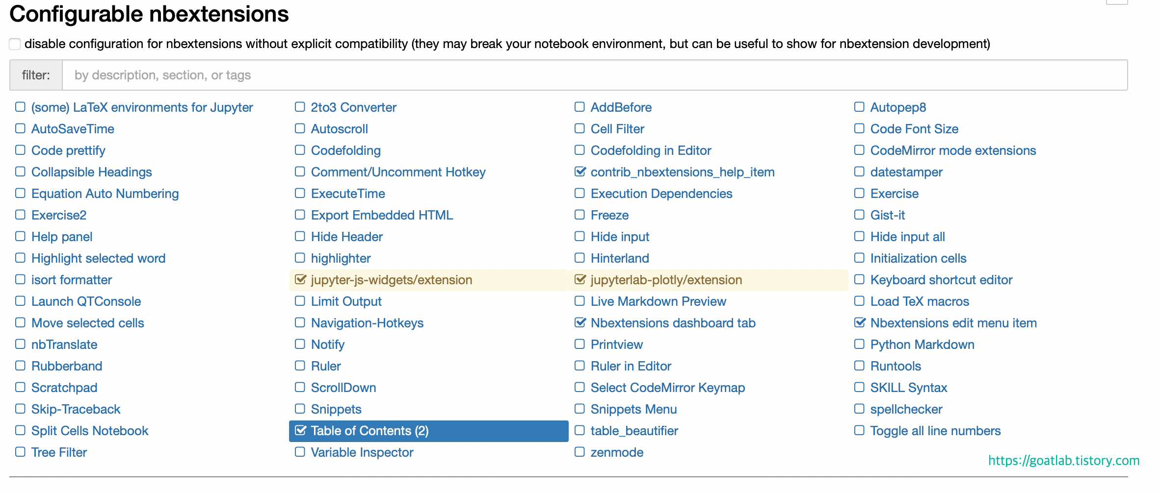 주피터 노트북 확장 프로그램으로, 실행 시간, 목차, 변수 탐색기 등 기능 사용 가능하다.