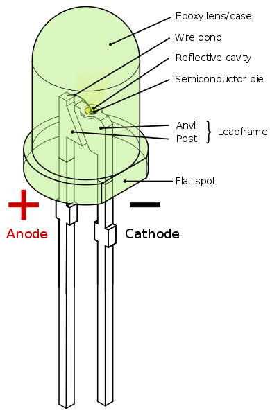 - 발광다이오드라 칭하며, 칼륨, 인, 비소 등을 재료로 한 다이오드 (diode)로 순방향으로 전류를 흘리면 빛을 발한다. - 빛의 색깔은 크리스털 도핑의 양과 종류에 따라 빨강, 노랑, 녹색, 파랑의 색을 나타낸다. - 일반 전구나 네온램프 등 다른 발광 소자와 비교하여 전기 빛의 변환 효율이 높으며, 열이 나지 않고, 소형 경량이기 때 문에 수명이 길다. - 각종 숫자·문자표시기, 카메라의 자동초점용 광원, 광통신용, 광고판, TV 등에 사용되며 응용범위가 넓다. - 보통 10~20mA 전류에 1.5V~2.5V 전압 강하 |