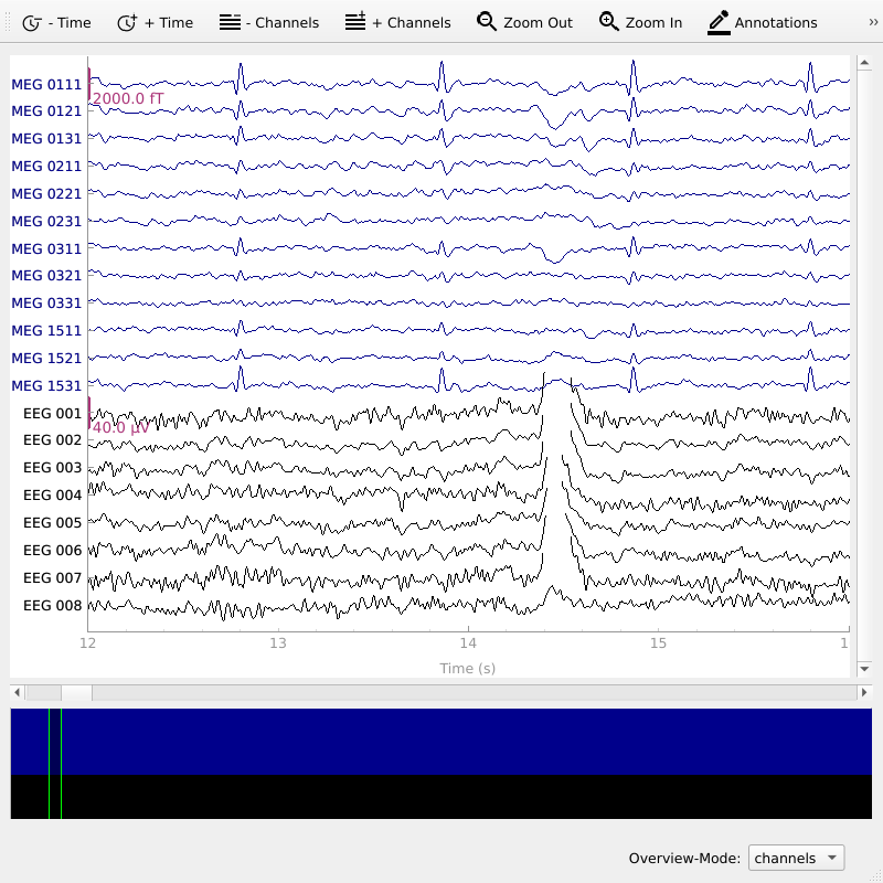 샘플 데이터 세트에는 자극 전달 컴퓨터에서 보낸 전기 신호를 기록하는 여러 "STIM" 채널 이 포함되어 있다 (간단한 DC 이동 / 방형파 펄스). 이러한 펄스 (종종 "트리거"라고 함)는 실험 이벤트를 표시하기 위해 이 데이터세트에서 사용된다. 개별 STIM 채널은 단일 채널로 결합되어 해당 채널의 전압 레벨이 특정 이벤트 유형으로 명확하게 디코딩될 수 있다. 이전 Neuromag 시스템 (ex. 샘플 데이터를 기록하는 데 사용)에서는 이 합산 채널이 호출 되었으므로 해당 채널 이름을 함수에 전달하여 자극 이벤트의 타이밍과 ID를 복구할 수 있다.