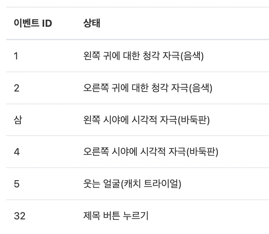 결과 이벤트 배열은 첫 번째 열에 샘플 번호가 있고 마지막 열에 정수 이벤트 ID가 있는 일반 3열이다. 중간 열은 일반적으로 무시된다. 정수 이벤트 ID를 추적하는 대신 정수 ID를 실험 조건 또는 이벤트에 매핑 하는 이벤트 사전 을 제공할 수 있다. 이 데이터세트에서 매핑은 다음과 같다.